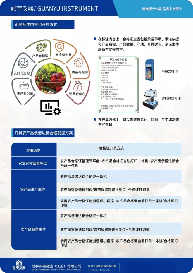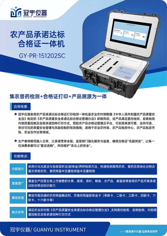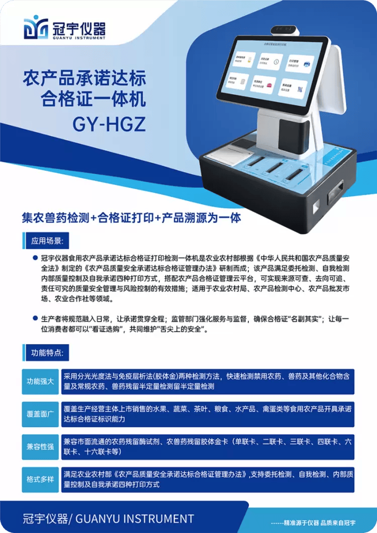 冠宇仪器制制(江苏)无限公司做为食物平安检测范畴的科技立异企业,精准把握市场脉搏,推出“食用农产物许诺达标及格证打印检测一体机”,为行业供给了一坐式处理方案。