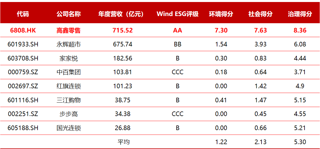 对于外部评价,虽然以MSCI为例的国外评级池并未纳入高鑫零售等国内上市商超,但正在国内评级上,以Wind ESG评级为例,高鑫零售则获评A,正在国内上市商超中大幅度领先。